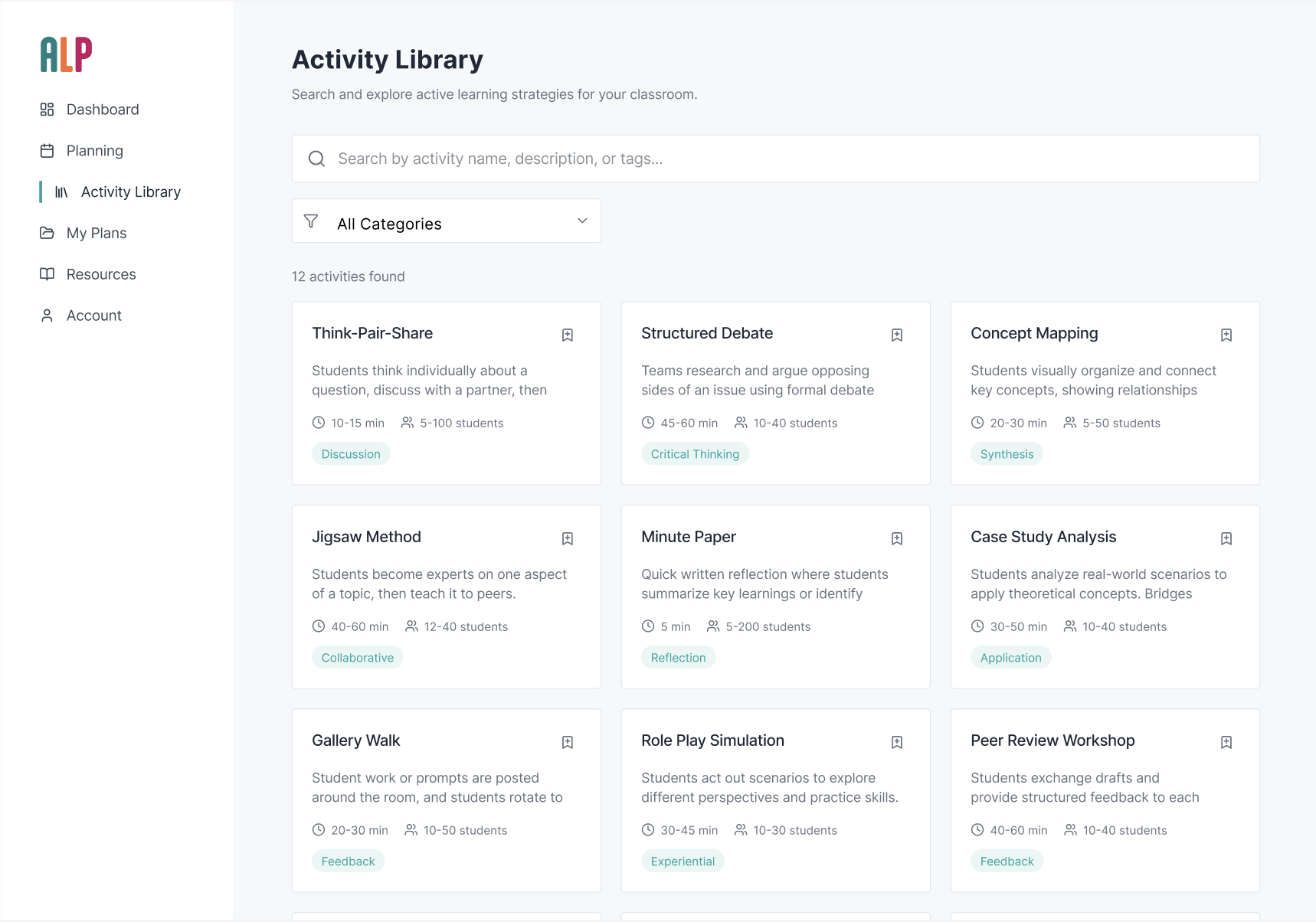 Filter-First UX: I designed a robust filtering system that allows an instructor to go from 'I have 10 minutes and 30 students' to a specific strategy in three clicks.